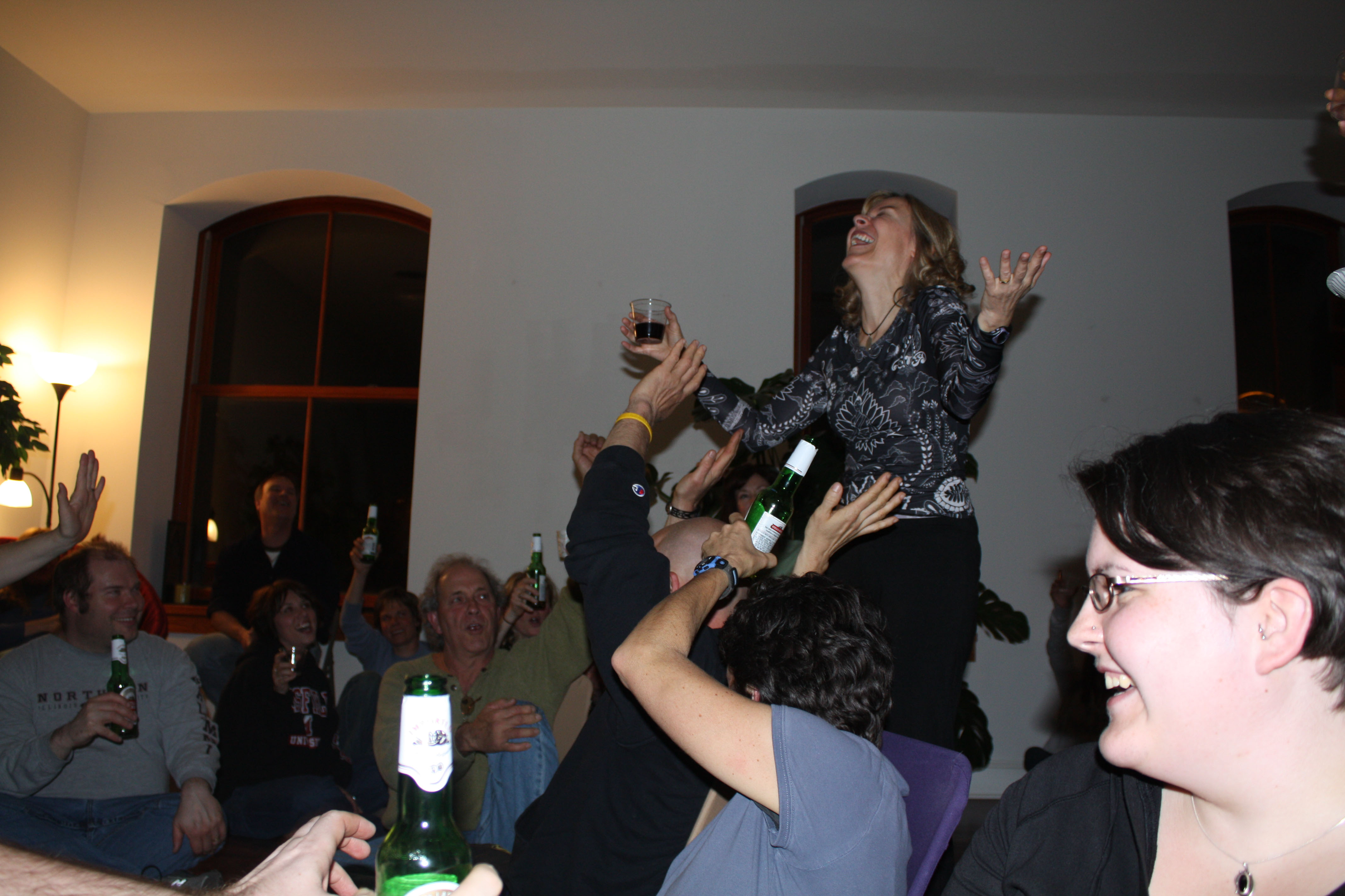 This is a picture of me being hoisted aloft at the End of the Challenge Party last year. I found it as I was going through the archives today. In a few days, there will be another party, another toast to our tribe, our yoga sangha, and all of our efforts this month.