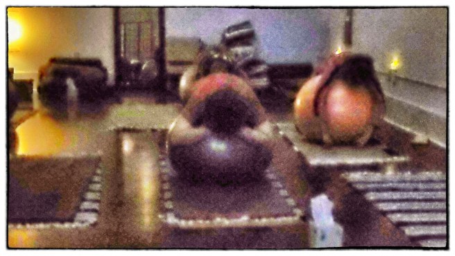 The balls are strangely okay this time around. I can’t figure out what is making this session of Yoga on the Ball different from the last time I taught it, when I vowed never to teach it again.
