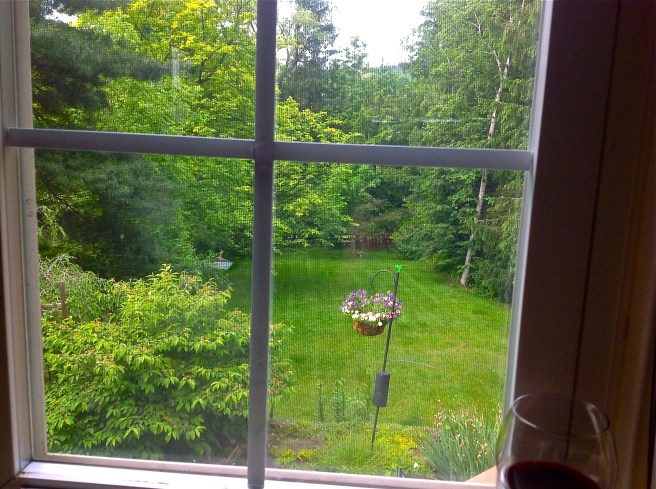 This is the view from the windowseat, where I am lying now, sipping wine, staring through the window, thinking that I probably should Windex the dog’s nose prints from the window before I take this picture, but I’m too lazy.