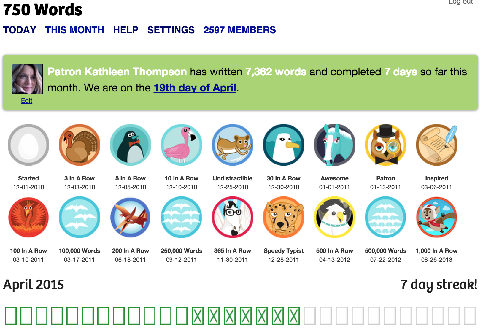 My longest streak on that platform was 1029 days. I have just about every badge on that platform except the NaNo badge. Next month I am going for it, which will entail writing 50K words in 1 month.