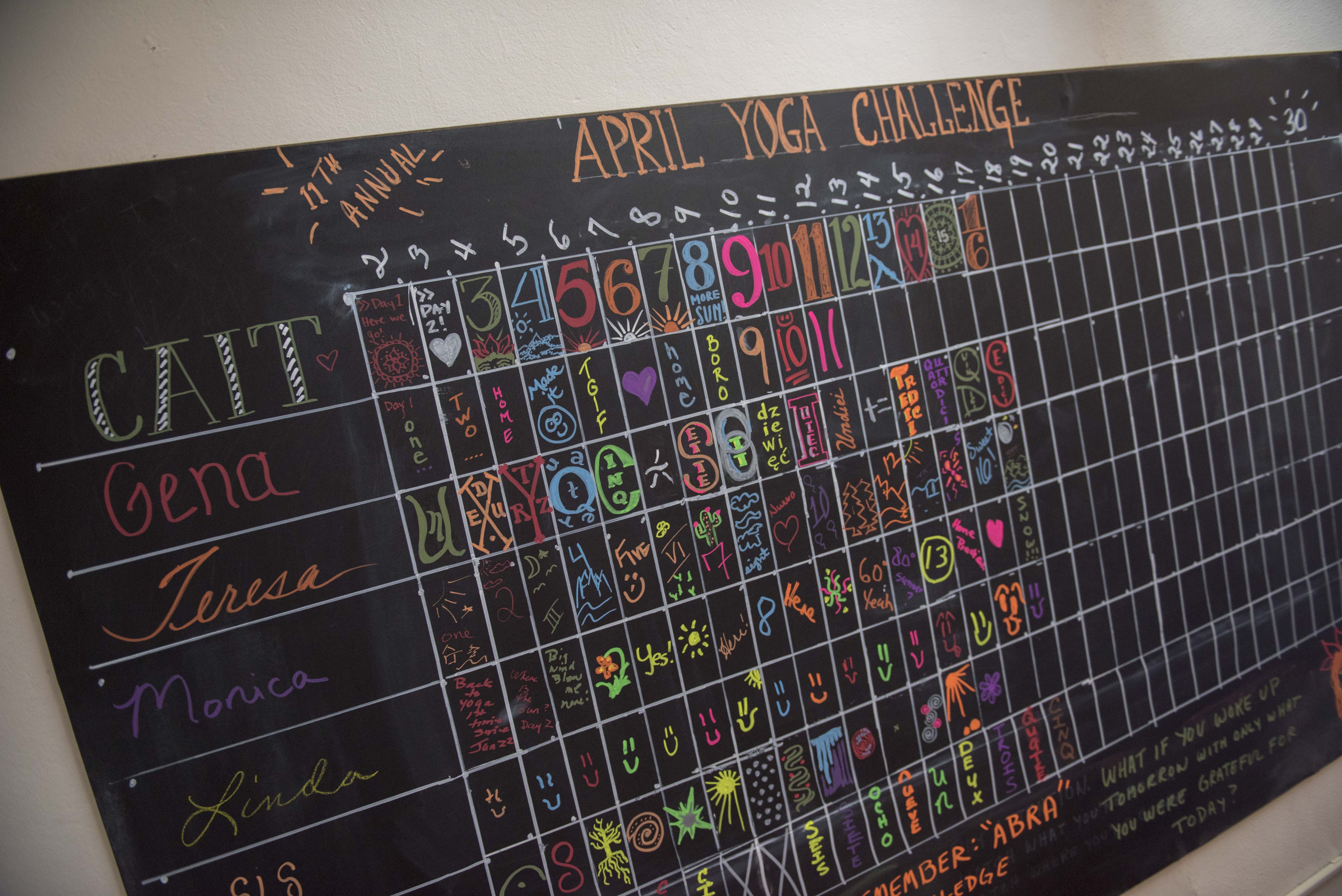 The game of the Challenge is that if you agree to come to class every day for 30 days, you only pay $30 for the entire month. There’s a leader board on the back wall where you sign in every day, and others can see your attendance and scribble notes of encouragement to you if they want.