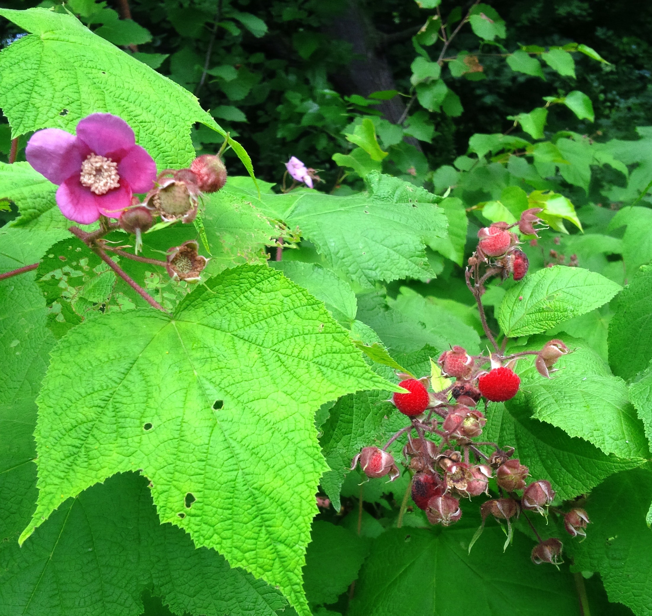 Yesterday I added Purple-flowering raspberry. It has a pink flower. They call it a scrambler bramble. (Say that ten times fast.)