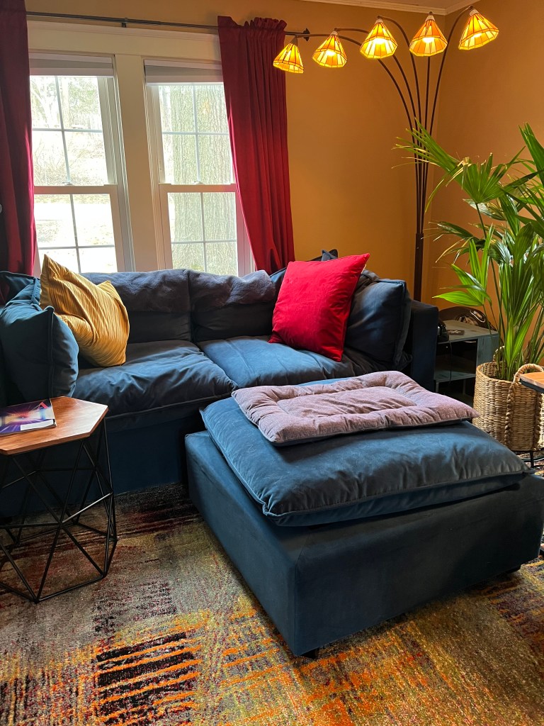 When the timer buzzed, I put another thirty minutes on it, fluffed all six couch cushions, plus the ottoman, then DustBusted them.
