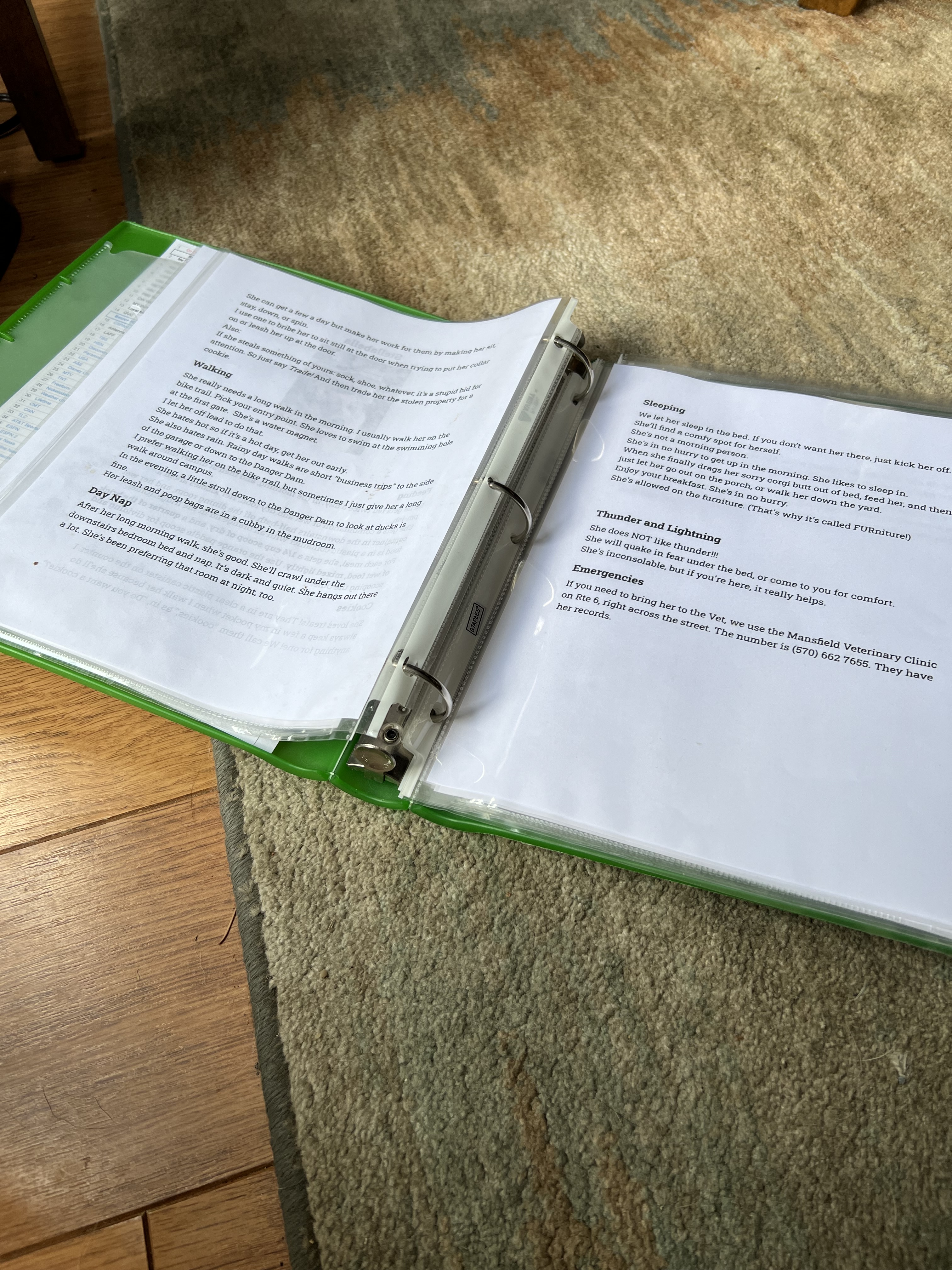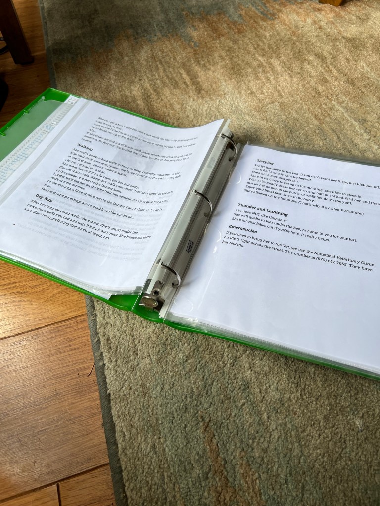It’s filled with instructions on everything from how to feed and care for the dog(s) to how to start the dishwasher.