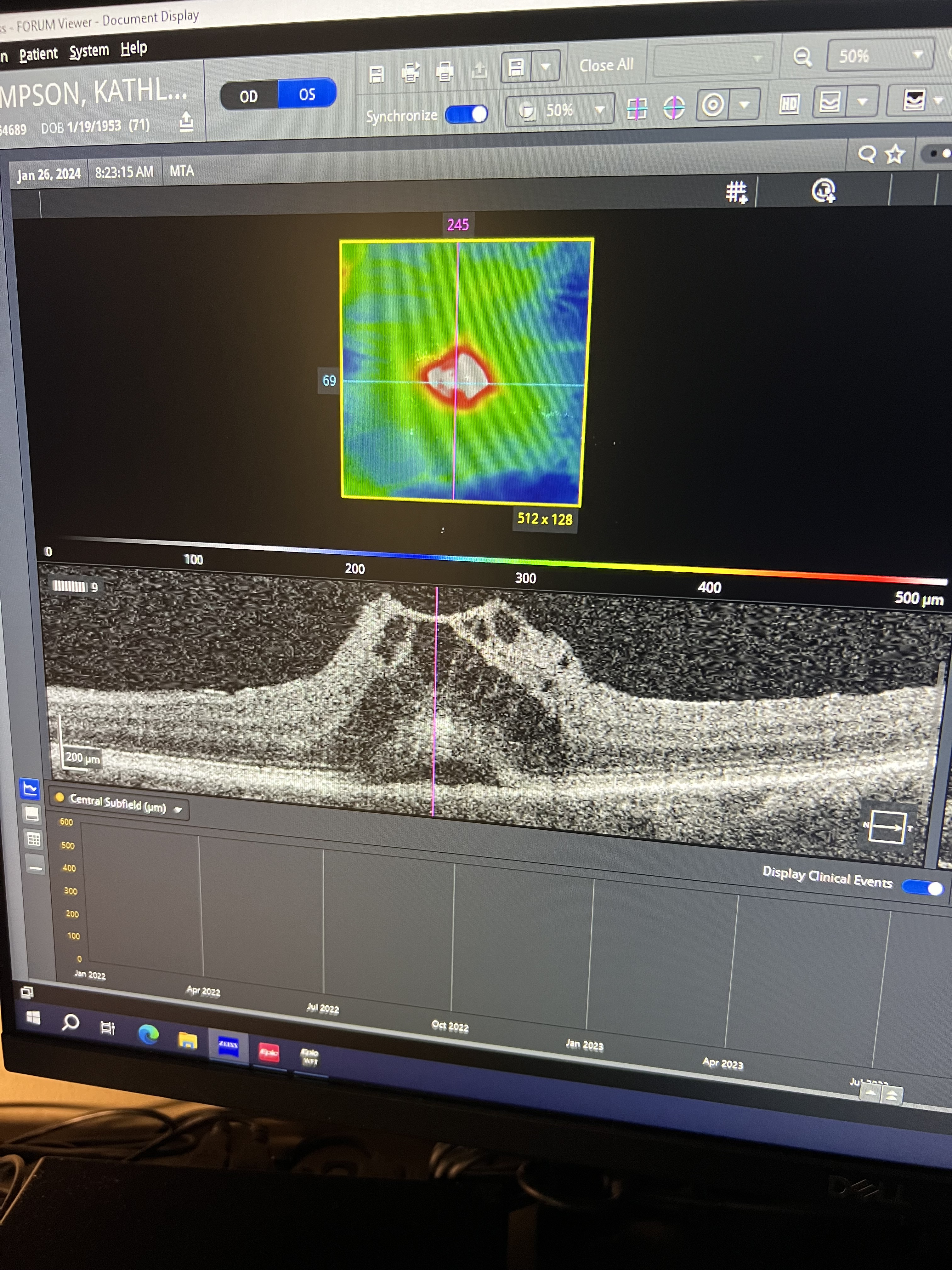 I saw my optometrist on Tuesday, and she said the blurriness was due to this retinal mountain of vitreous fluid that’s tractioning up. Until that’s fixed, my vision will continue to be blurry.