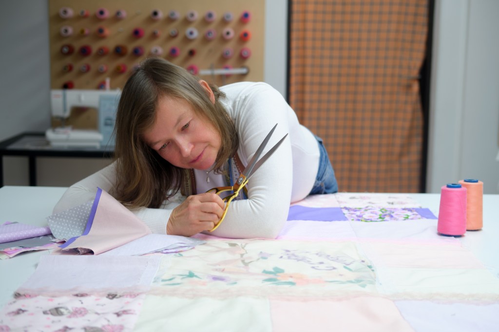 Connie is working on a quilt. Every chance she gets, she’s in her sewing room, working on her design, arranging her pieces, putting them together in patterns.