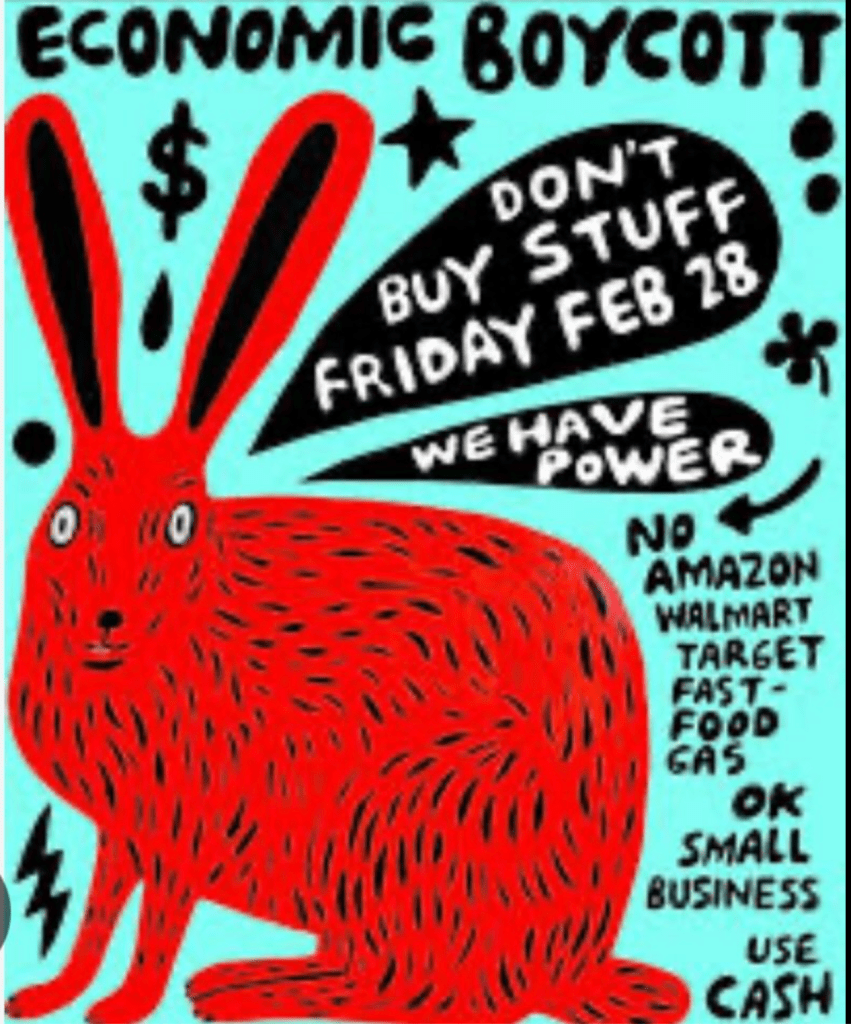 Okay, so that’s how February rolled. Tomorrow is February 28th, the first economic boycott, and in addition to not buying anything, I’m not engaging with social media at all. I will probably stay off all devices tomorrow. Digital Sabbath. I need it.