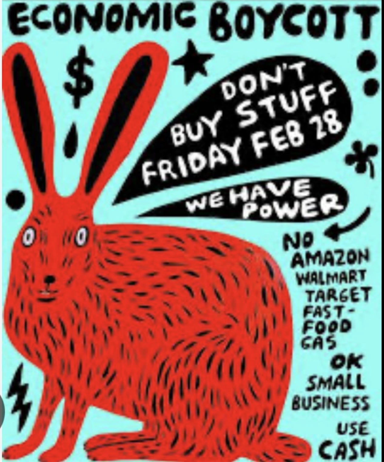 Okay, so that’s how February rolled. Tomorrow is February 28th, the first economic boycott, and in addition to not buying anything, I’m not engaging with social media at all. I will probably stay off all devices tomorrow. Digital Sabbath. I need it.