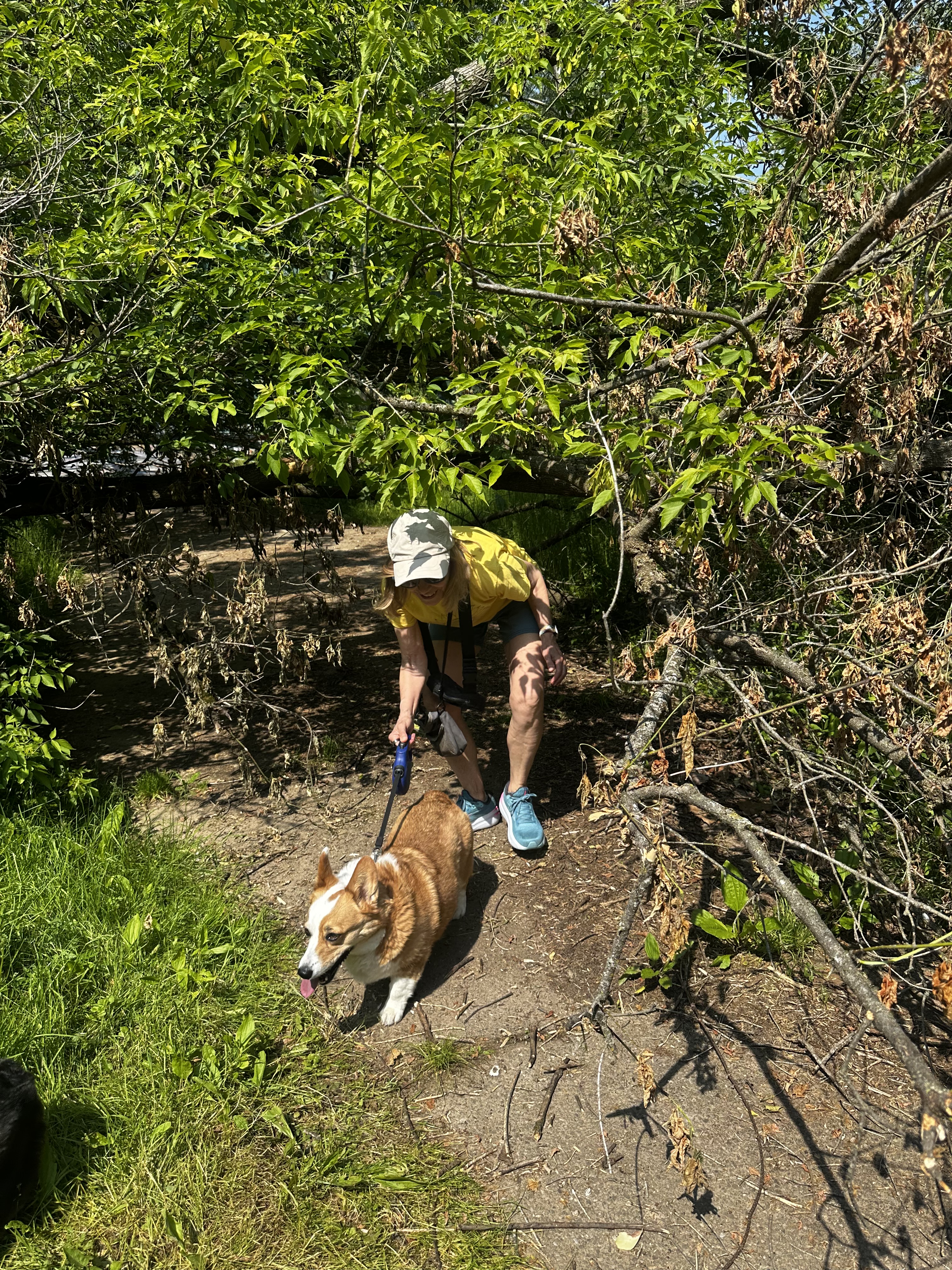 I know Zee would say this because she has said this to me on other occasions when I’ve used self-deprecating language to describe my behavior.  And she is right. And I need to use this incident as a reminder to take it easy, go slower when I’m trying to negotiate two rambunctious corgis under a fallen tree— or in any situation, really.